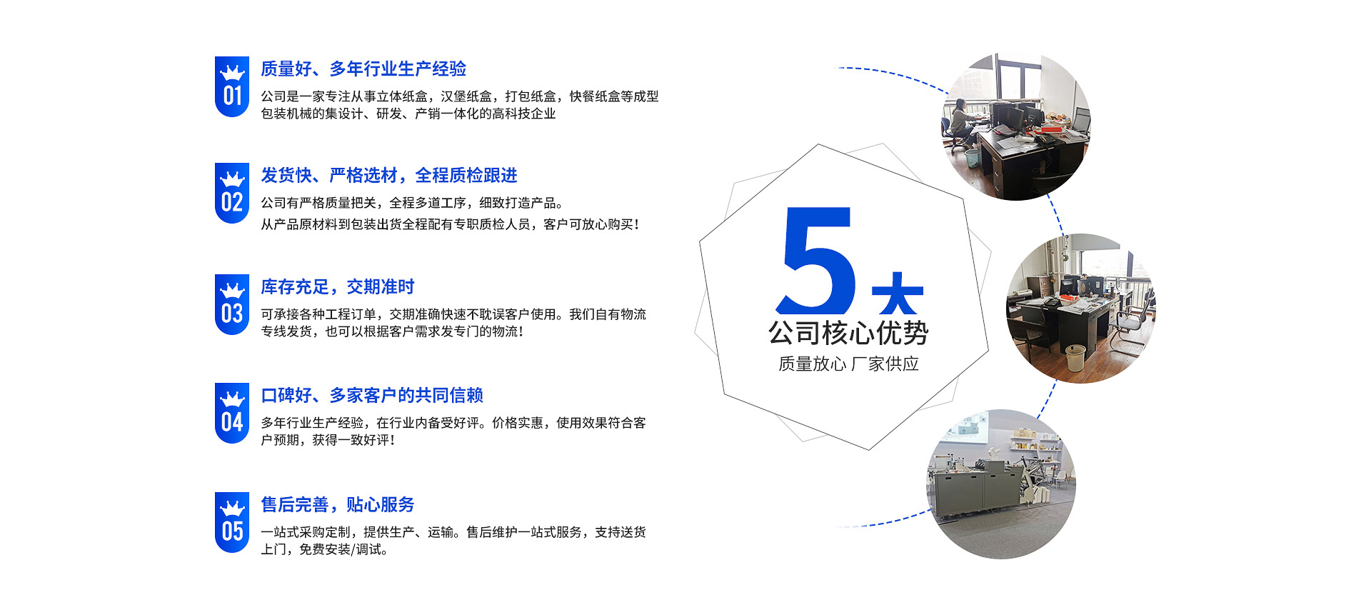 瑞安市中法機械有限公司是一家從事立體紙盒機,漢堡紙盒機,打包紙盒機,快餐紙盒機等成型包裝機械的設計、研發、產銷一體化的高科技企業。公司有現代化的管理體系和完善的售后服務體系;有一支具有充滿青春活力的精銳研發團隊!自成立以來,中法公司堅守“誠信、學習、發展”的企業發展理念,堅持“以誠信為道、以質優取勝”的經營原則,在市場競爭中取得了良好的社會和經濟效益!